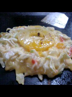 上の写真は、その祝賀会が開かれた鉄板焼き屋にて注文した「フルーツお好み焼き」。