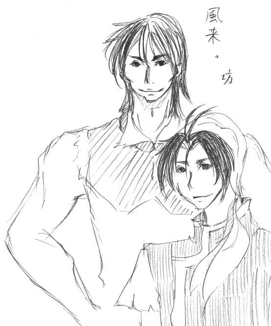 そんな中、ベッドに寝転がりながらWJを下敷きに描いた一枚。資料がなくても描けそうなキャラ、というとこの2人くらいしか浮かばなかったので風来+坊のツーショット。幻水シリーズ通して大好きな人たちでもあります。早く出したい。が、彼らを出すには150年早い。